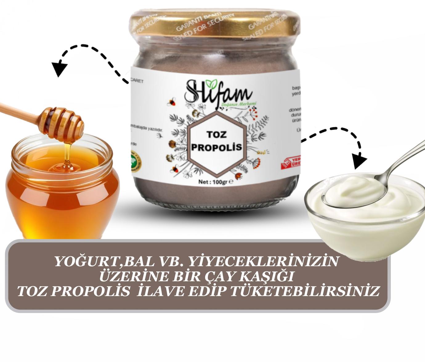 Toz propolis, bu doğal maddenin işlenmiş ve kurutulmuş hali olup ince toz formuna getirilmiştir.